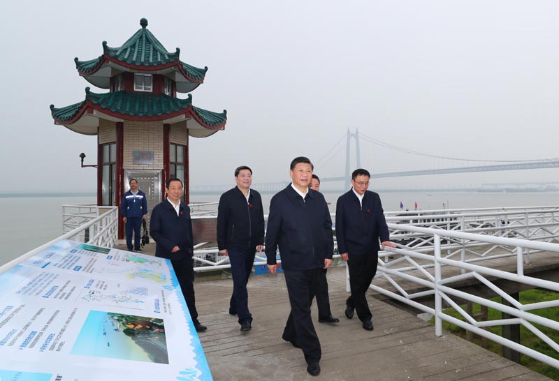 25日一大早,习近平前往荆州市荆州港码头乘船,沿江察看两岸生态环境和发展建设情况。途中,习近平分别听取湖北省和荆州市关于非法码头整治情况汇报,听取交通运输部关于长江航运、航道治理情况和水利部关于河势控制、护岸工程情况汇报。